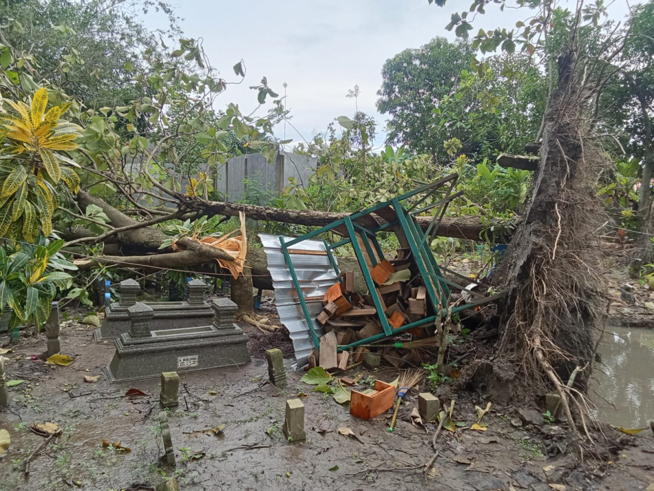 Purwosari(18/2/2026). Hujan deras disertai angin kencang yang terjadi pagi ini mengakibatkan beberapa rumah warga rusak ringan serta pohon tumbang. Tiga batang pohon jati di dalam area Makam Kusumo Loyo, Saribaru, Purwosari tumbang dan menimpa tempat penyimpanan kitab yang tepat berada di bawahnya. Beberapa nisan juga ikut terangkat bersama akar pohon.